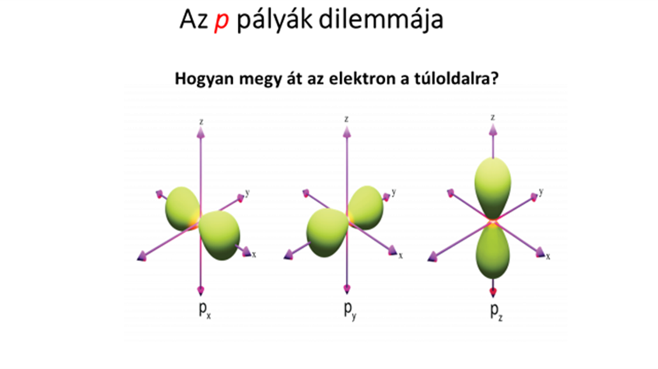 A Hidrogén atom elektronpályái közül válasszuk ki a p pályákat, melynek térbeli eloszlását láthatjuk. Ennek az a jellemzője, hogy van egy sík, ami a pálya két részét szétválasztja. Vagyis az elektron lehet a sík fölött is, meg alatt is, viszont a síkban nem lehet. Ha tényleg mozogna az elektron, akkor hogyan tudna átmenni a sík fölötti tartományból az alattiba úgy, hogy soha sincs magában a síkban.
