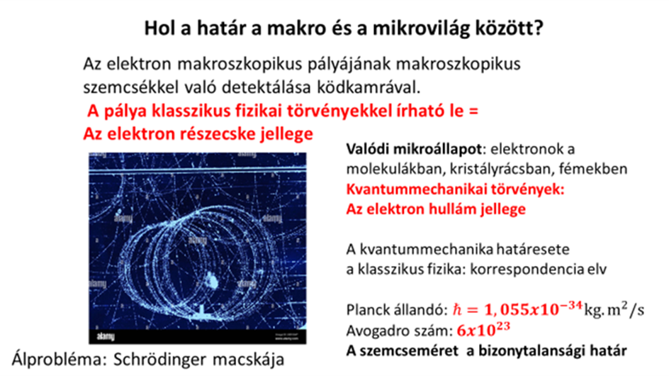 Nézzük először a ködkamra felvételt, ami mágneses mezőben készült egy elektron útjáról, ami kissé növekvő sugarú körpályához vezet. Vajon ez a pálya már a mikrovilághoz tartozik? A válasz nem, noha egyetlen elektron útját mutatja, de makroszkopikus eszközökkel. A köd parányi elemei ugyan kisebbek egy milliméternél, de mégis csak makroszkopikus objektumok, minden egyes csepp víz molekulák trillióiból tevődik össze. Valójában az elektron által megváltoztatott ködcseppeket látunk, ez az elektron útjának nyoma. Tehát nem magát az elektront látjuk, csak azt a pályát, amit befutott. Az elektron minden egyes ködcseppel reagálva valamit lead lendületéből és energiájából, ezért a mágneses mező kissé növekvő sugarú pályára kényszeríti, de amikor ezt a pályát matematikailag leírjuk, nem a kvantummechanika törvényeit alkalmazzuk, hanem a klasszikus fizikáét, az elektrodinamika és a mechanika szokásos törvényeit. A mikrovilág törvényére, a kvantummechanikára akkor van szükség, ha az elektronokat egy molekulában, vagy egy kristályrácsban, vagy egy fémes vezetőben vizsgáljuk, ekkor beszélhetünk a részecske és hullámtermészet kettősségéről. A mikro és makrovilágot egy rendkívül kis és egy rendkívül nagy szám választja ketté: az egyik a ћ = s Planck állandó, a másik az Avogadró szám 6·1023. Ez azt jelenti, hogy a kvantum lépés nagysága rendkívül kicsi, észrevehetővé akkor válik, ha az Avogadro számú mikro-objektumról van szó. A kvantummechanika törvényei a korrespondencia elve szerint, akkor mennek át a klasszikusba, ha nagy az objektumok száma, vagy nagy a kvantumszám értéke. Ebben a határesetben már a klasszikus mechanika írja le a mozgásokat.