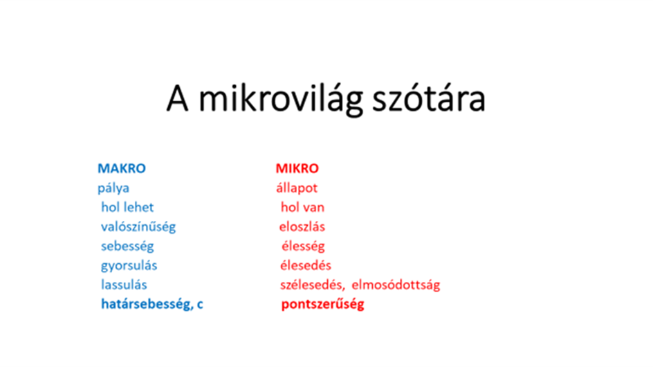 Összefoglalásként elkészítettem egy kis szótárt, amiben lefordítom a makrovilág fogalmait a mikro világéra. Kiindulópont a pálya, melynek helyébe az állapot lép. Az idő leváltója a valószínűség, de ezt is másképp értelmezzük a mikrovilágban, itt már jobb helyette tartózkodási eloszlást mondani. Amikor a makrovilág fogalmait használjuk a mikrovilág mozgásainak leírására, akkor tesszük fel a kérdést, hogy az elektron hol lehet. De ha sikerül továbblépni és már a mikrovilág fogalmaiban gondolkodunk, már az lesz a helyes kérdés, hogy hol van az elektron, azaz mekkora súllyal tartózkodik az elektron a tér különböző tartományaiban. A világ egysége is megjelenik a kvantummechanikában. Az elektron tartózkodási súlya az atomban a magtól bármekkora távolságban is megjelenik, bár ez a súly a Gauss eloszlást követve csak az atom belsejében jelentős, de azért mindenütt ott van. Ebben az értelemben a világ összes elektronja egyetlen nagy egységet alkot. Bármely két elektront kiválasztva van közöttük „párbeszéd”.