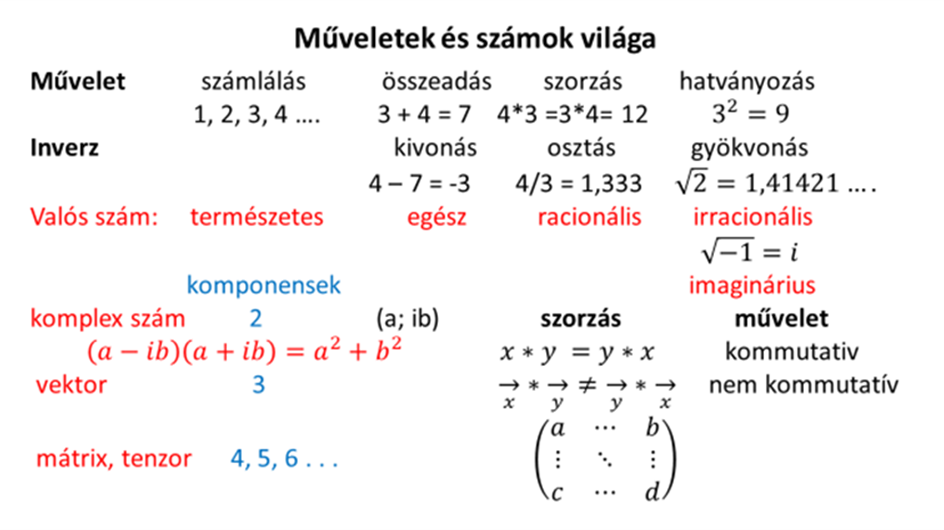 Az egyes számrendszerek definíciójában is kibontakozik a fokozatos átmenet a valóság és a képzelet világa között. Az egyes számok megalkotója a művelet, ami egyrészt létrehozza a számokat, másrészt kapcsolatba hozza őket. A szám az alany, a művelet az állítmány. A legősibb művelet a számlálás, például számba vehetjük, hogy hány diót találtunk, így alakul ki az 1,2,3 …. és innen felfelé. Ezeket nevezzük természetes számoknak. Azért természetes, mert közvetlenül kapcsolódik a természet megismeréséhez. De kialakíthatunk kupacokat a diók között, az egyikben legyen, mondjuk 3, a másikan 4. Az összegüket meghatározhatjuk egyesévek megszámlálva, de ha már előtte megszámoltuk, hogy 3 illetve 4 van bennük, akkor meggyorsíthatjuk a számbavételt az összeadás műveletével. Ez csak egy csoportosítást jelent, ami nem alkot meg új számrendszert, maradunk a természetes számok halmazánál. Ott lép be a matematikai absztrakció, amikor felvetjük az összeadás művelet fordítottját a kivonást. Ezt nevezzük az összeadás inverz műveletének. Az inverz művelet sajátossága, hogy kibővíti a számrendszerünket. Ha egy kisebb számból nagyobbat vonunk ki, akkor jutunk el a negatív számokhoz. A negatív és pozitív számokat együtt már egész számoknak nevezzük. De hozzunk létre egy új csoportosítást, amikor 3 elemből álló kupacokat csinálunk, mondjuk négyet. Ekkor ahelyett, hogy négyszer egymás után végeznénk el az összeadást, bevezetjük a szorzás műveletét. Maga a szorzás csak újabb csoportosítás, mi nem vezet ki az egész számok világából, de ha újra megfordítjuk a műveletet, eljutunk az osztáshoz is. Ez tovább bővíti a számrendszerünket, eljutunk a racionális számok világába. Ezt racionálisnak nevezzük, mert még nem távolodtunk el messze a természetből kiinduló művelettől. De a szorzást is megismételhetjük néhányszor, ezt nevezzük hatványozásnak. Ez is csak egy újabb csoportosítási elv, ezért ekkor még a racionális számok halmazánál maradunk. Megváltozik ismét a helyzet, ha megfordítjuk a hatványozást és bevezetjük annak inverzét a gyökvonást. Itt már újra kiegészül a számhalmaz, például ha 2-ből vonnunk gyököt. Ekkor olyan számhoz jutunk, ami nem állítható elő két egész szám hányadosaként. Ezzel kilépünk a racionális számok halmazából és irracionális számokról beszélünk. Ide már olyan számok is tartoznak, ami még gyökvonással sem adhatók meg. Ilyen ismert szám a pi, ami a kör kerületének és átmérőjének hányadosa. Összességében az eddigi számokat valós számnak nevezzük, amivel azt fejezzük ki, hogy a szokásos valóságból kiindulva tudjuk levezetni ezeket a számokat. De a matematika ezen is túl lép, amikor felveti a lehetőséget, hogy vonjunk gyököt a negatív számokból is. Ez a lépés már tényleg csak matematikai képzeletünk terméke, ezért ezt a terméket már imaginárius számnak nevezzük, aminek egysége az „i”, ami a -1-ből vont négyzetgyököt jelenti.