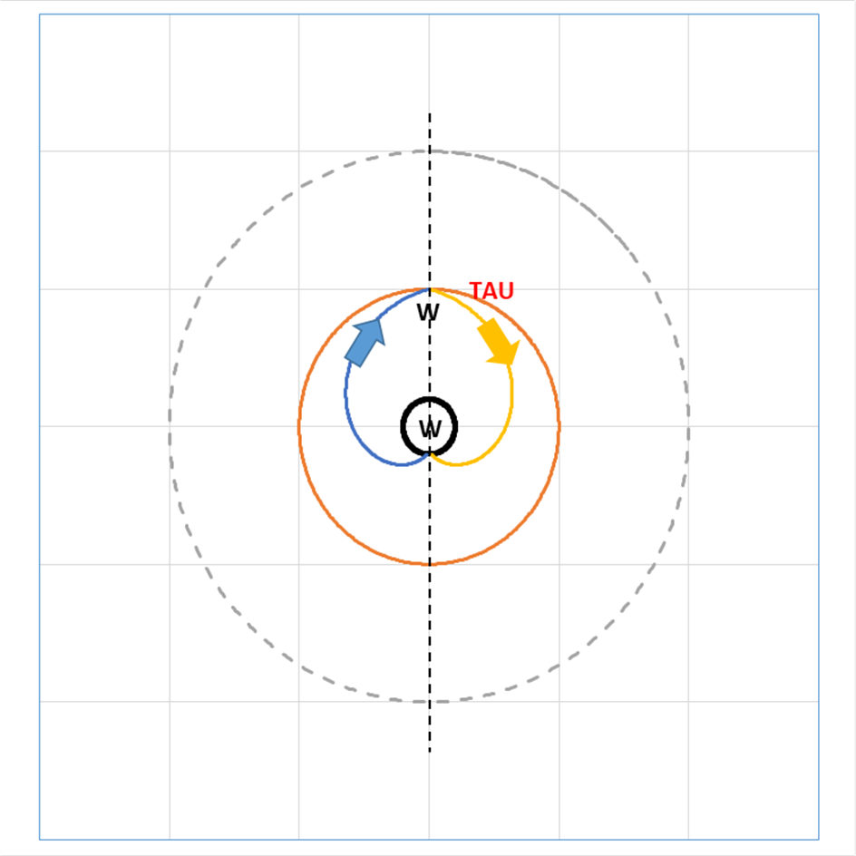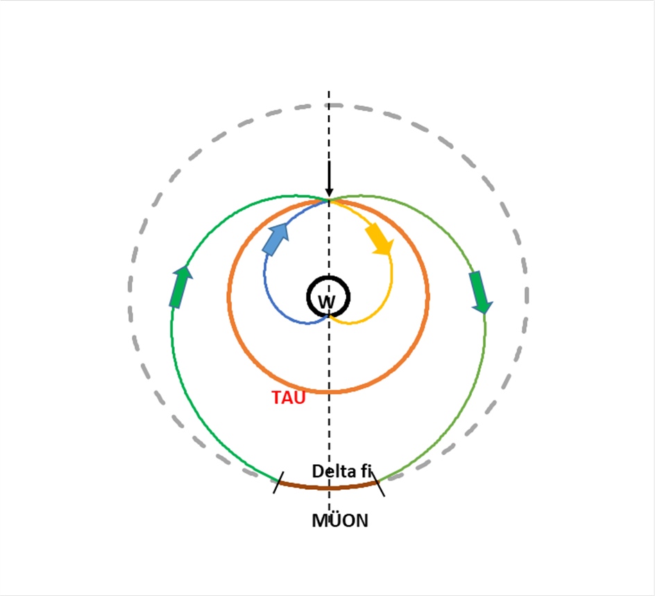 - Ábra. A W bozon pályája a belső és a tau-müon ciklusban. A W bozont mutatja a belső fekete kör, a tau pálya a piros, a külső szaggatott kör a müon. A W spirális a tau kör feletti vékony nyíltól indul, a belső W-tau ciklust jelzi a sárga nyíl és a kék nyíl. A tau-müon ciklus W spirálja a piros tau körön kívül halad, zöld nyilak jelzik a két szakaszt, lent látható az egyenletes frekvenciájú delta fi szakasz.